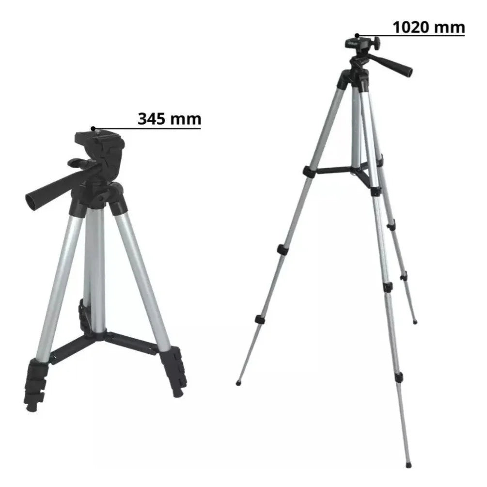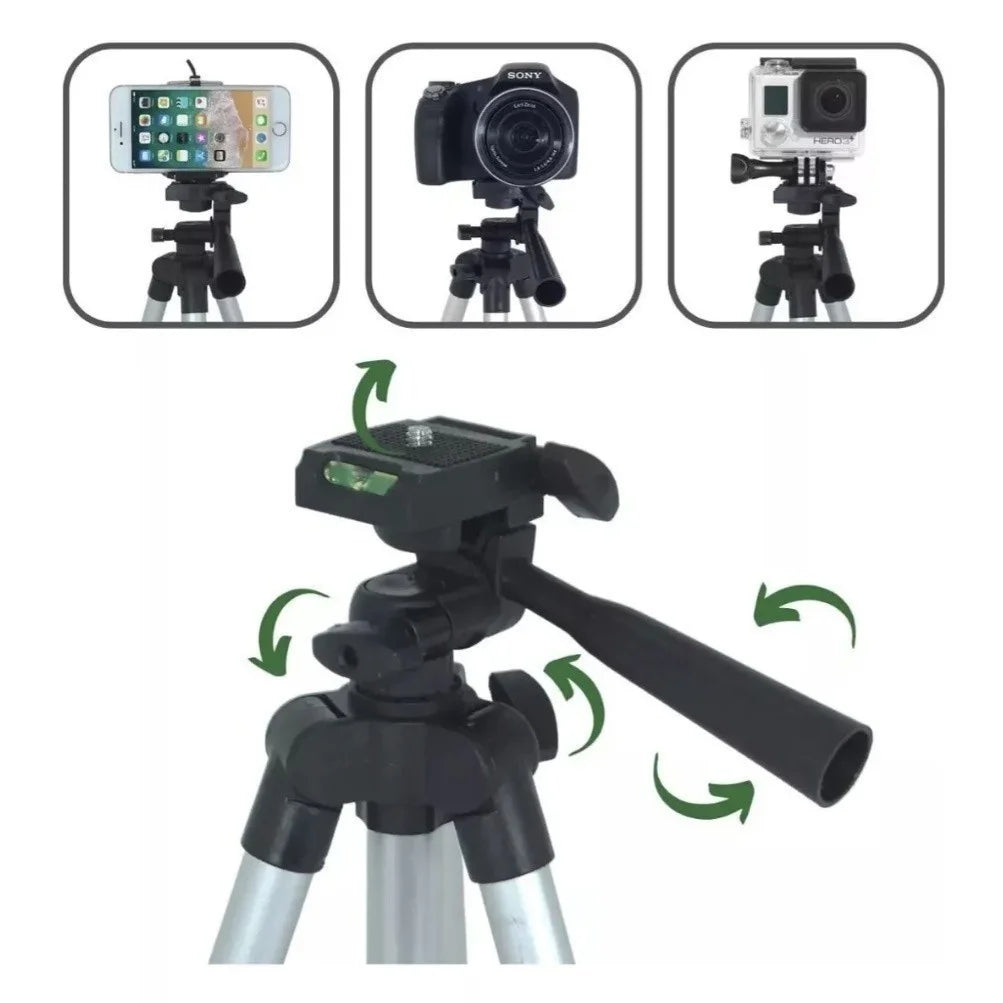 Feito com materiais leves e duráveis, o tripé é fácil de transportar, ideal para viagens, eventos ou uso diário. A sua compatibilidade universal se adapta a diversos modelos de celulares, câmeras compactas e até mesmo câmeras DSLR leves, graças ao seu suporte robusto e seguro.
